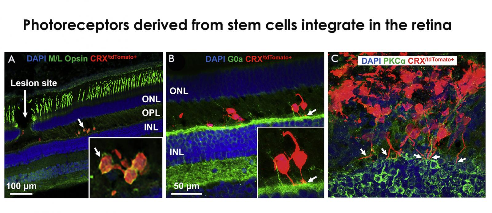 Gamm and Williams fluorescently labeled photoreceptors generated from stem cells and placed them in the retinas of macaques. Migration of the precursor photoreceptors (red) away from the lesion site where they were initially placed in the retina is shown (image A). Neurites from the transplanted cells were in contact with host neurons (image B). Photoreceptor precursor cells extended axons toward bipolar cells, another type of neuron in the host macaque’s retina (image C).[5]