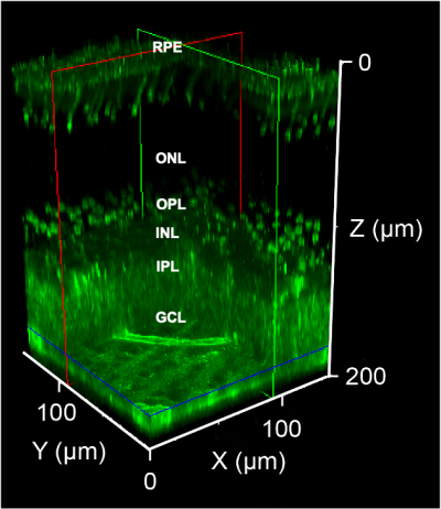 3D reconstruction of mouse retina from two-photon excitation fluorescence imaging. Labeled retinal structures are the ganglion cell layer (GCL), inner plexiform layer (IPL), inner nuclear layer (INL), outer plexiform layer (OPL), outer nuclear layer (ONL), and retinal pigment epithelium (RPE). Credit: Krzysztof Palczewski, Ph.D.