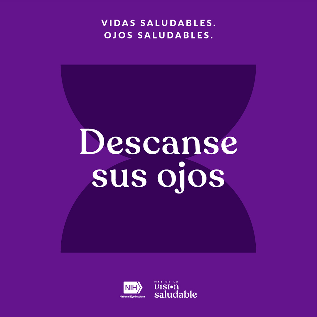 Mirar pantallas por mucho tiempo puede cansarle la vista y la mente. Cuide de ambos con descansos de 20-20-20: Cada 20 minutos, mire a algo a 20 pies de distancia por 20 segundos. Conozca más del @NatEyeInstitute: https://www.nei.nih.gov/espanol/MantengaOjosSanos. #MesDeLaVisionSaludable
