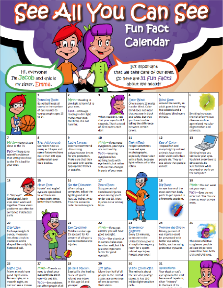 This calendar has fun facts about sports-related eye safety, animal eyes, common eye conditions, and myths about eye health.