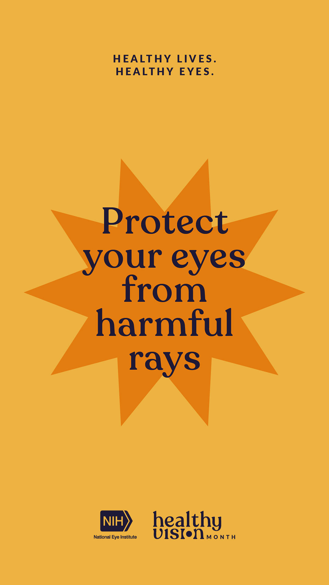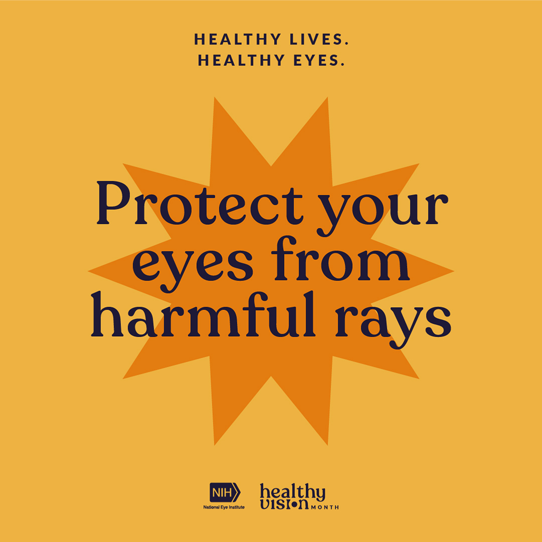 Too much time in the sun can build up gradually and hurt your vision. To protect your eyes, wear sunglasses that block UVA and UVB rays when you go outside. Even on cloudy days! Share more eye health resources for #HealthyVisionMonth from @NatEyeInstitute: https://www.nei.nih.gov/HVM