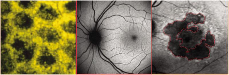 Left. Retinal pigment epithelium (RPE) bis-retinoids form complex granules known as lipofuscin, which increase with age, and glow gold under blue light. Middle. Normal gray scale fundus autofluorescence (FAF) image. Right. FAF image of a patient with the dry form of age-related macular degeneration. Credit: Asia Pac J Ophthalmol (Phila). 2020 May-Jun; 9(3): 269–277. Published online 2020 Jun 1.