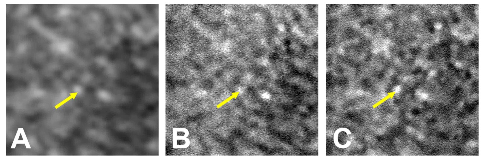Comparison of the same patch of retina labeled with indocyanine green and visualized 3 different ways. A) Scanning laser ophthalmoscopy. B) AI-enhanced scanning laser ophthalmoscopy. C) Adaptive optics scanning laser ophthalmoscopy. Arrows highlight the same cell seen in different modalities. Credit: Johnny Tam