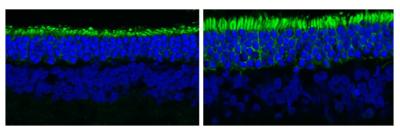 The preservation of rod photoreceptor structure is shown in these representative images involving female rats. Rod photoreceptors are labeled with REEP6 (green). Rod photoreceptor inner segments are shorter in the control-treated rats (left) compared with those treated with reserpine (right). Credit: Anand Swaroop