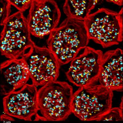 Array of cone photoreceptor terminals labeled for PSD95 (red), the glutamate receptors belonging to one type of bipolar cell (yellow), and glutamate re-uptake transporters (cyan). Courtesy of Steven DeVries.